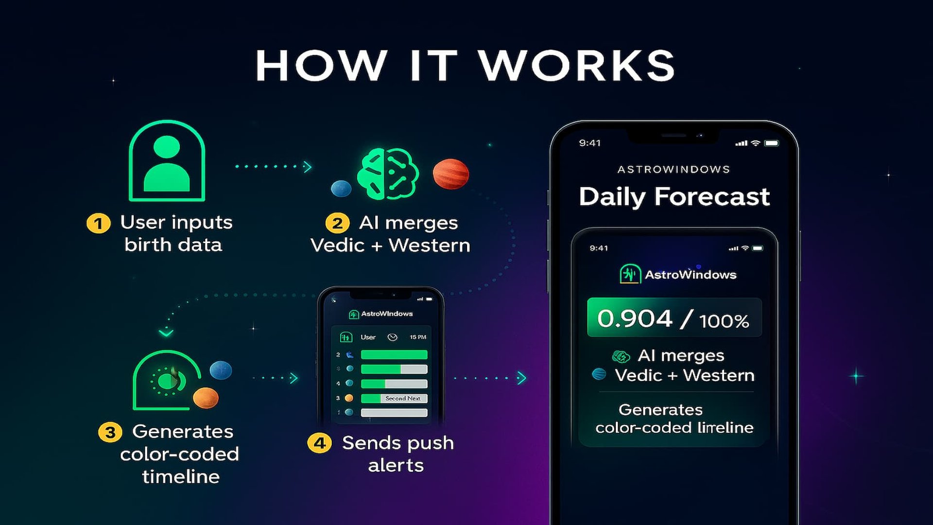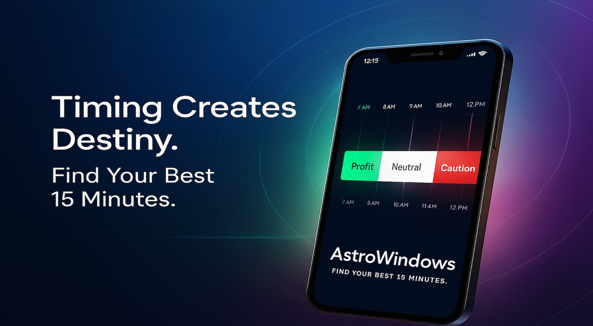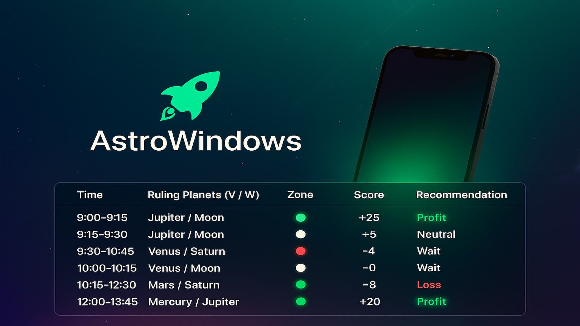 Most apps give vague daily blurbs. AstroWindows pinpoints actionable micro-windows—every 15 minutes—by combining Vedic Hora timing with Western planetary transits. You’ll see a simple color line for your day: 🟢 Profit, ⚪ Neutral, 🔴 Caution. Set alerts to act when the odds align. It’s timing intelligence you can actually use for trading, outreach, focus work, and decisions.
